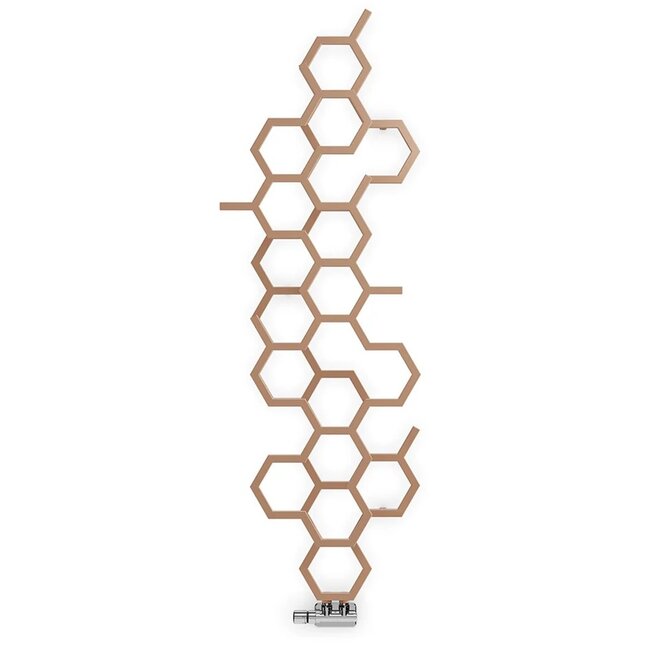 De Hex-serie van Terma is ontworpen met een unieke zeskantstructuur die een speelse, geometrische twist geeft aan de traditionele radiatorvorm. De rose koperkleur zorgt voor een warme, luxe uitstraling die perfect past bij zowel moderne als industriële interieurs.